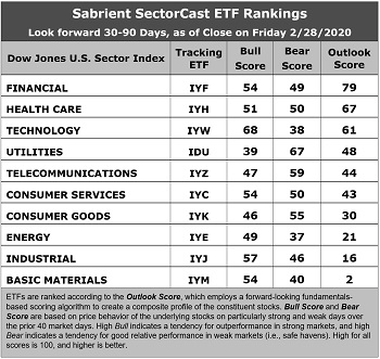 Outlook score is forward-looking while Bull and Bear are backward-looking. As a group, these three scores can be helpful for positioning a portfolio for a given set of anticipated market conditions. Of course, each ETF holds a unique portfolio of stocks and position weights, so the sectors represented will score differently depending upon which set of ETFs is used. We use the iShares that represent the ten major U.S. business sectors: Financial (IYF), Technology (IYW), Industrial (IYJ), Healthcare (IYH), Consumer Goods (IYK), Consumer Services (IYC), Energy (IYE), Basic Materials (IYM), Telecommunications (IYZ), and Utilities (IDU). Whereas the Select Sector SPDRs only contain stocks from the S&P 500 large cap index, I prefer the iShares for their larger universe and broader diversity.