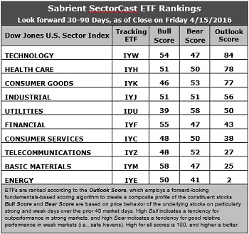 Outlook score is forward-looking while Bull and Bear are backward-looking. As a group, these three scores can be helpful for positioning a portfolio for a given set of anticipated market conditions. Of course, each ETF holds a unique portfolio of stocks and position weights, so the sectors represented will score differently depending upon which set of ETFs is used. We use the iShares that represent the ten major U.S. business sectors: Financial (IYF), Technology (IYW), Industrial (IYJ), Healthcare (IYH), Consumer Goods (IYK), Consumer Services (IYC), Energy (IYE), Basic Materials (IYM), Telecommunications (IYZ), and Utilities (IDU). Whereas the Select Sector SPDRs only contain stocks from the S&P 500, I prefer the iShares for their larger universe and broader diversity. Fidelity also offers a group of sector ETFs with an even larger number of constituents in each.