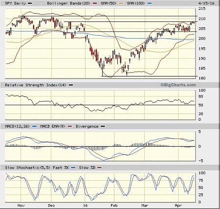 The SPDR S&P 500 Trust (SPY) closed Monday at 207.78 and remains above all its major moving averages (i.e., 20-day, 50-day, 100-day, and 200-day). It formed a bullish W-pattern in February, which was confirmed at the start of March on the breakout above 195. It then filled the bearish gap from 204, consolidated there, and then broke out to the upside in mid-March, retested new resistance-turned support at 204, and then started moving higher again last week to challenge previous resistance levels, starting with 209 (from December). The 50-day SMA is pointing upward bullishly and crossing up through the 100-day (near 200), with the 200-day not much further away (just beyond 201). On the other hand, volume has been falling. If price can’t break through the 209 level right away, SPY may pull back and trade in the channel between 204 and 209 until a catalyst emerges -- perhaps improving forward guidance as earnings are announced. After cycling back to neutral, oscillators RSI, MACD, and Slow Stochastic are back to overbought territory. I expect a retest of support at 204 before another attack on resistance at 209.