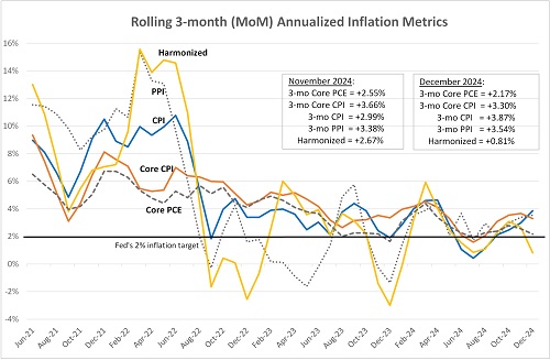 I prefer to monitor annualized 3-month averages for a better handle on the current trend. So, with all the December metrics posted, although the annualized 3-month averages for CPI and Core CPI are above +3%, we find the Fed’s preferred Core PCE at +2.17%. Also, the European method Harmonized Index of Consumer Prices (HICP) has essentially flatlined at just +0.81%, as shown in the chart below.