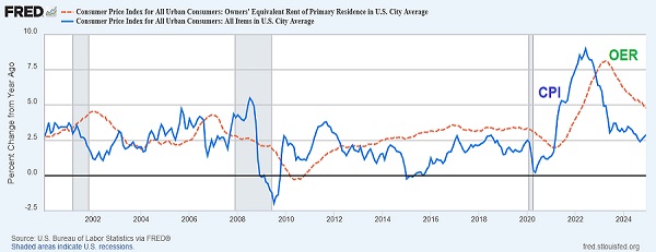 Because shelter cost accounts for 36% of the CPI calculation, and the Owner’s Equivalent Rent (OER) component of shelter alone accounts for 25% of CPI, it deservedly commands attention and scrutiny. As shown in the chart below, OER has been steadily falling from +8.1% in April 2023 to +4.8% in December, and yet it still may be overstating real-time inflationary pressures due to its long lag time in reflecting current trends in rent.