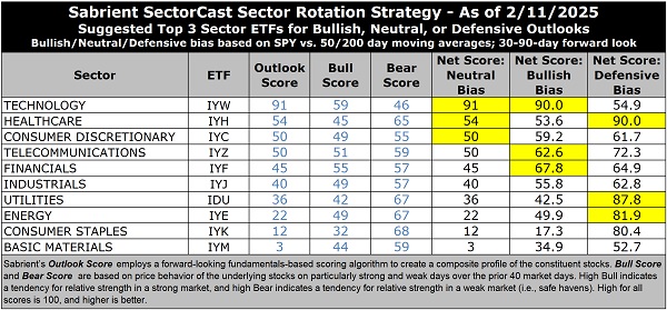 Our rules-based Sector Rotation model, which appropriately weights Outlook, Bull, and Bear scores in accordance with the overall market’s prevailing trend (bullish, neutral, or defensive), returned to a bullish bias in mid-January when the SPY closed solidly back above its 50-day moving average while also staying above its 200-day. (Note: In this model, we consider the bias to be bullish from a rules-based trend-following standpoint when SPY is above both its 50-day and 200-day simple moving averages, but neutral if it is between those SMAs while searching for direction, and defensive if below both SMAs.)