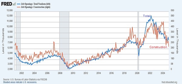 The December JOLTS report (released on 2/4) showed that job openings fell from a March 2022 peak of 12.18 million to 7.60 million (vs. consensus estimate of 8.0 million), which is the second lowest reading since the pandemic lockdowns. Likewise, all-important construction jobs have been plummeting in a recessionary pattern from a peak in February 2024 of 456,000 to just 217,000. Openings in both construction and manufacturing are around their pandemic-lockdown lows. However, it’s hard to know what to believe with these surveys as response rates have fallen to around 33%.