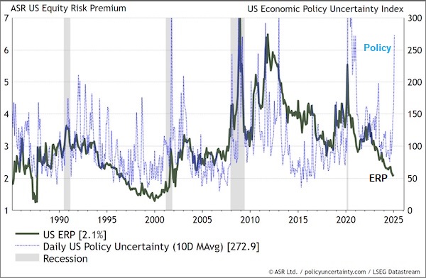 The low ERP suggests that inflation and interest rate expectations are much lower than current CPI and bond yields would suggest. ASR macro strategist Ian Harnett posted the chart below displaying today’s ultra-low ERP despite elevated uncertainty about US government policies.