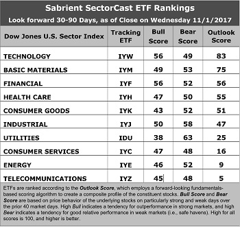 Outlook score is forward-looking while Bull and Bear are backward-looking. As a group, these three scores can be helpful for positioning a portfolio for a given set of anticipated market conditions. Of course, each ETF holds a unique portfolio of stocks and position weights, so the sectors represented will score differently depending upon which set of ETFs is used. We use the iShares that represent the ten major U.S. business sectors: Financial (IYF), Technology (IYW), Industrial (IYJ), Healthcare (IYH), Consumer Goods (IYK), Consumer Services (IYC), Energy (IYE), Basic Materials (IYM), Telecommunications (IYZ), and Utilities (IDU). Whereas the Select Sector SPDRs only contain stocks from the S&P 500, I prefer the iShares for their larger universe and broader diversity.