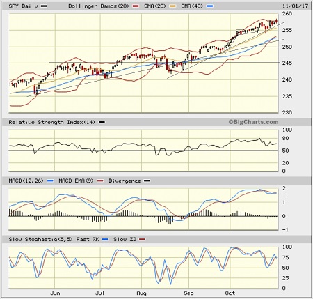 The SPDR S&P 500 ETF (SPY) closed Wednesday, November 1, at 257.49. The convincing breakout above the 250 level (corresponding to 2,500 on the S&P 500) at the end of September continued into early October, forming what appears to have been a bull flag continuation pattern (to catch its breath). The flag had an eager-looking upslope to it, then a slight pullback ahead of the earnings reports from some big tech bellwethers, and now the appearance of an important breakout. The 2-month uptrend line coincides with the 20-day simple moving average. Oscillators RSI, MACD, and Slow Stochastic are each in a position where they might either cycle a bit lower to gather steam or simply plow further ahead from here. Support comes at the 20-day SMA (approaching 256), then the breakout level at 255, followed by the 50-day SMA (near 252) that has been providing pretty solid support all year, then a prior breakout at 250, the 100-day (near 248), prior resistance-turned-support at 245, and the critical 200-day SMA (approaching 243). SPY still hasn’t tested its 200-day SMA since the election. I expect the bullish sentiment and technical breakout to hold at least through year end, unless some form of major unwanted (“Black Swan”) news event sends investors running for cover.