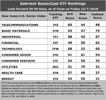 Outlook score is forward-looking while Bull and Bear are backward-looking. As a group, these three scores can be helpful for positioning a portfolio for a given set of anticipated market conditions. Of course, each ETF holds a unique portfolio of stocks and position weights, so the sectors represented will score differently depending upon which set of ETFs is used. We use the iShares that represent the ten major U.S. business sectors: Financial (IYF), Technology (IYW), Industrial (IYJ), Healthcare (IYH), Consumer Goods (IYK), Consumer Services (IYC), Energy (IYE), Basic Materials (IYM), Telecommunications (IYZ), and Utilities (IDU). Whereas the Select Sector SPDRs only contain stocks from the S&P 500 large cap index, I prefer the iShares for their larger universe and broader diversity.