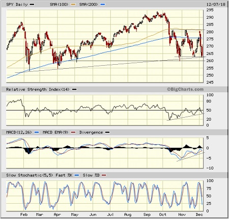 The SPDR S&P 500 ETF (SPY) closed Friday at 263.57 and seems to be either: 1) pounding out a triple bottom from which to launch a year-end recovery rally, or 2) getting ready to break down through important support at the full-year uptrend line as a “death cross” sets in (the 50-day simple moving average crossing down through the 200-day SMA). Ever since the mid-October correction, price has oscillated between resistance at the 100-day moving average around 282 and support around 263, where the full-year uptrend line is now converging. As oscillators RSI and MACD have cycled back down, they have been putting in higher lows, which is bullish; however, a retest of the October low at 260 may be in the cards. Notably, despite all the worrisome news and fear-mongers predicting an imminent recession, the SPY did not hit new lows for the year during all the Q4 turbulence. Although the technical picture does not look pretty, I don’t anticipate a major selloff from here, although a retest of the April or February lows can’t be ruled out given the horrid investor sentiment.