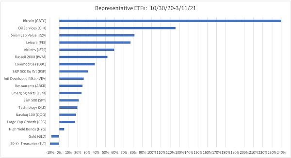 When Q1 earnings season kicks in next month, value stocks should benefit from relatively easy YOY comparisons, while growth stocks face tougher comps. As a result, market breadth has widened considerably over the past several months from the narrow mega-cap leadership that was so pervasive for so long. Equal weighting tends to outperform cap weighting during periods of economic strength, rising commodity prices, rising longer-term interest rates, and lower volatility. And indeed, the Invesco S&P 500 Equal Weight (RSP) has outperformed the cap-weighted SPDR S&P 500 (SPY) over the 10/30/20-3/11/21 timeframe (+31% vs. +21%). And on a trailing 12-month (TTM) basis, RSP is +54% vs. SPY at +46%, while RZV is +143%, Russell 2000 small caps (IWM) is +87%, iShares MSCI Emerging Markets (EEM) is +49%, and the long-shunned VanEck Vectors Oil Services (OIH) is +140%.