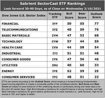 Outlook score is forward-looking while Bull and Bear are backward-looking. As a group, these three scores can be helpful for positioning a portfolio for a given set of anticipated market conditions. Of course, each ETF holds a unique portfolio of stocks and position weights, so the sectors represented will score differently depending upon which set of ETFs is used. We use the iShares that represent the ten major U.S. business sectors: Financial (IYF), Technology (IYW), Industrial (IYJ), Healthcare (IYH), Consumer Goods (IYK), Consumer Services (IYC), Energy (IYE), Basic Materials (IYM), Telecommunications (IYZ), and Utilities (IDU). Whereas the Select Sector SPDRs only contain stocks from the S&P 500 large cap index, I prefer the iShares for their larger universe and broader diversity.