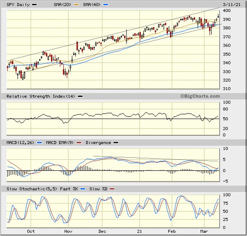 The SPDR S&P500 Trust (SPY) closed out Thursday at 393.53 after attaining a new record intraday high. It continues its 4.5-month internal broadening and rotation into the value and cyclical sectors. Notably, since the value rotation kicked in decisively on 11/1/20, the Invesco S&P 500 Equal Weight ETF (RSP) has outperformed the SPY by 10 percentage points (pps) while the Russell 2000 small caps (IWM) have outperformed by a whopping 31 pps! The daily chart below displays a 6-month bullish rising channel that continues to hold at both resistance and support, albeit with a few downside violations (due to various negative news events) that quickly reversed. Price is now back in the center of the channel with a neutral posture, and although oscillators RSI, MACD, and Slow Stochastics are all pointing upwards, all could go either way from here, and MACD displays a negative divergence (lower highs).