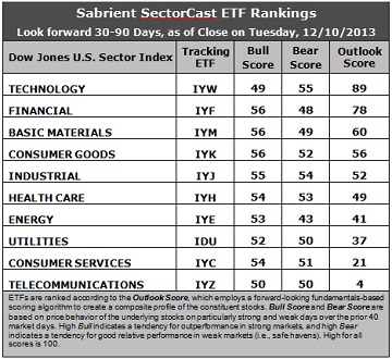 Latest rankings: The table ranks each of the ten U.S. business sector iShares ETFs by Sabrient's proprietary Outlook Score, which employs a forward-looking, fundamentals-based, quantitative algorithm to create a bottom-up composite profile of the constituent stocks within the ETF. The multi-factor model considers forward valuation, historical earnings trends, earnings growth prospects, the dynamics of Wall Street analysts' consensus estimates, accounting practices and earnings quality, and various return ratios. In addition, the table also shows Sabrient's proprietary Bull Score and Bear Score for each ETF.