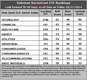 Outlook score is forward-looking while Bull and Bear are backward-looking. As a group, these three scores can be helpful for positioning a portfolio for a given set of anticipated market conditions. Of course, each ETF holds a unique portfolio of stocks and position weights, so the sectors represented will score differently depending upon which set of ETFs is used. We use the iShares that represent the ten major U.S. business sectors: Financial (IYF), Technology (IYW), Industrial (IYJ), Healthcare (IYH), Consumer Goods (IYK), Consumer Services (IYC), Energy (IYE), Basic Materials (IYM), Telecommunications (IYZ), and Utilities (IDU). Whereas the Select Sector SPDRs only contain stocks from the S&P 500, I prefer the iShares for their larger universe and broader diversity. Fidelity also offers a group of sector ETFs with an even larger number of constituents in each.