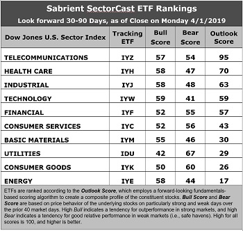 Outlook score is forward-looking while Bull and Bear are backward-looking. As a group, these three scores can be helpful for positioning a portfolio for a given set of anticipated market conditions. Of course, each ETF holds a unique portfolio of stocks and position weights, so the sectors represented will score differently depending upon which set of ETFs is used. We use the iShares that represent the ten major U.S. business sectors: Financial (IYF), Technology (IYW), Industrial (IYJ), Healthcare (IYH), Consumer Goods (IYK), Consumer Services (IYC), Energy (IYE), Basic Materials (IYM), Telecommunications (IYZ), and Utilities (IDU). Whereas the Select Sector SPDRs only contain stocks from the S&P 500 large cap index, I prefer the iShares for their larger universe and broader diversity.