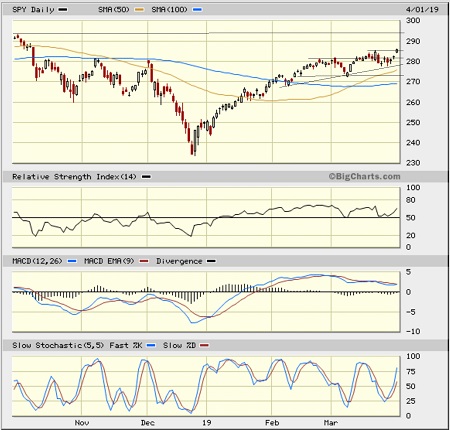 The SPDR S&P 500 ETF (SPY) closed Monday (April 1) just below 286. After some much-needed technical consolidation in March following the huge recovery rally from the Q4 selloff, price is threatening an upside breakout and a challenge to the all-time high. As I said at the beginning of April, I expected some profit-taking and consolidation of gains to work off overbought technicals and gather bullish conviction, which it did with little pullback in price as investors were loath to sell for fear of missing out on further gains. After a failed first attempt in mid-March at a sustained breakout through the 280 level, the current rally seems to have the energy and conviction required. Oscillators RSI, Slow Stochastic, and MACD all continue to point bullishly upward, and price remains above all of its key daily moving averages. I think an upside breakout is imminent.