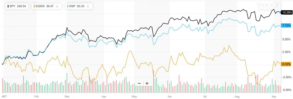 This year, however, although Sabrient’s January Baker’s Dozen is outperforming the S&P 500 (as of 9/8/17), the overall market has returned to more of that narrow, momentum-driven climate, led by the mega caps, similar to what we experienced in late 2015, which we would not look upon as healthy or sustainable. This largely has been driven by the preponderance of capital flows into passive products that are overwhelmingly cap-weighted. Below is a chart comparing the performance of the market-cap-weighted S&P 500 (SPY), the equal-weight S&P 500 (RSP), and the equal-weight Russell 2000 (EQWS) to illustrate the lack of breadth. The performance differentials are striking. Not only has the cap-weighted SPY (+10.3% YTD) diverged from the equal-weighted RSP (+7.7%), but the equal-weight small caps (EQWS) has badly underperformed so far this year (+0.1%). On an encouraging note, small caps greatly outperformed during the late-August rebound, along with other riskier segments like biotechs, e.g., the SPDR S&P Biotech ETF (XBI), and retail, e.g., the SPDR S&P Retail ETF (XRT).