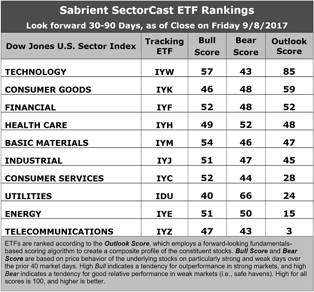 Outlook score is forward-looking while Bull and Bear are backward-looking. As a group, these three scores can be helpful for positioning a portfolio for a given set of anticipated market conditions. Of course, each ETF holds a unique portfolio of stocks and position weights, so the sectors represented will score differently depending upon which set of ETFs is used. We use the iShares that represent the ten major U.S. business sectors: Financial (IYF), Technology (IYW), Industrial (IYJ), Healthcare (IYH), Consumer Goods (IYK), Consumer Services (IYC), Energy (IYE), Basic Materials (IYM), Telecommunications (IYZ), and Utilities (IDU). Whereas the Select Sector SPDRs only contain stocks from the S&P 500, I prefer the iShares for their larger universe and broader diversity.