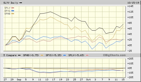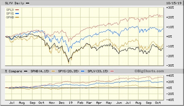 And zooming in to look just since 8/27/19, when the market seemed to want to close that massive divergence in a hurry, you can see that after pulling back from their rapid rally, SLYV and SPHB are again leading the charge over the past several days (albeit along with SPYG) at the expense of low-volatility SPLV.