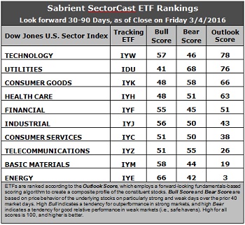 Outlook score is forward-looking while Bull and Bear are backward-looking. As a group, these three scores can be helpful for positioning a portfolio for a given set of anticipated market conditions. Of course, each ETF holds a unique portfolio of stocks and position weights, so the sectors represented will score differently depending upon which set of ETFs is used. We use the iShares that represent the ten major U.S. business sectors: Financial (IYF), Technology (IYW), Industrial (IYJ), Healthcare (IYH), Consumer Goods (IYK), Consumer Services (IYC), Energy (IYE), Basic Materials (IYM), Telecommunications (IYZ), and Utilities (IDU). Whereas the Select Sector SPDRs only contain stocks from the S&P 500, I prefer the iShares for their larger universe and broader diversity. Fidelity also offers a group of sector ETFs with an even larger number of constituents in each.