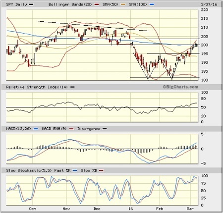 The SPDR S&P 500 Trust (SPY) closed Friday just above the 200 mark, and then faced a little consolidation on Monday at this resistance level, closing the day at 199. After bouncing strongly from the long-standing support line of “last resort” near 182, and then forming a bullish W-pattern, it confirmed the W by rising above the 195 level, and now is in the process of challenging resistance levels, starting with the 200 price level (which we knew would be a tough test), which also happens to be the 100-day simple moving average. If successful, next resistance is the bearish gap down from 204 at the beginning of the year that should act as a magnet. Beyond that, there is a line of lower highs since last May as well as a broad rounding top to contend with, once it gets above 204. SPY is now above its short-term 20-day simple moving average and its 50-day simple moving average, but still below the 200-day SMA (near 202). Oscillators RSI, MACD, and Slow Stochastic are all looking a tad overbought and need to either consolidate for a bit or pull back. Support should come in at the 195 level (resistance-turned-support).