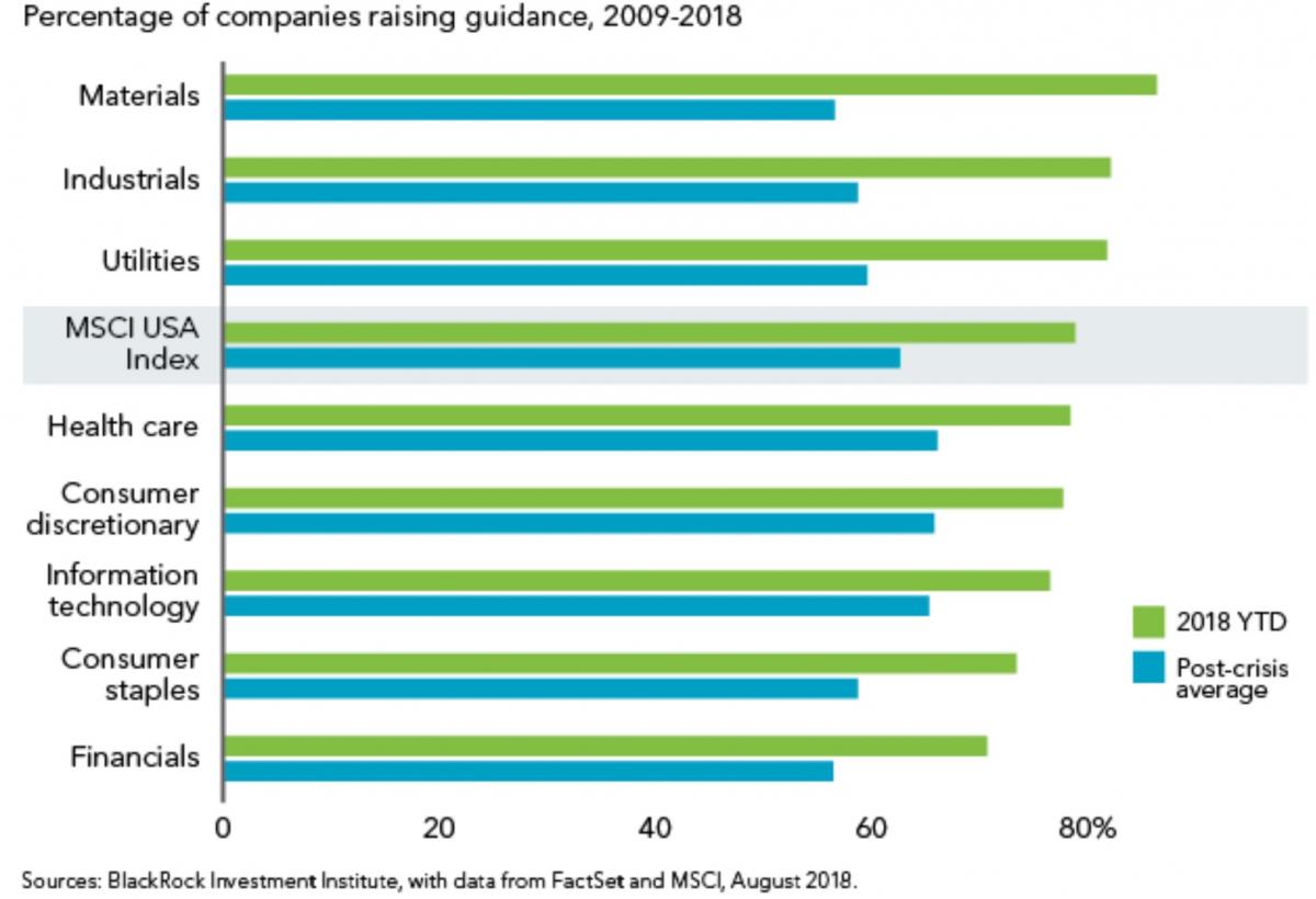 Indeed, the tables below show how much better the EPS growth for next 12 months (NTM) and forward P/E ratio are when we replace the original estimates for Q1 and Q2 with actual reported EPS numbers for the January Baker’s Dozen stocks, along with current prices. In addition, the second graphic published by BlackRock shows that Materials and Industrials companies have been raising guidance this year much more than the post-Financial Crisis average, despite the trade wars. Unless guidance suddenly weakens significantly and the analyst community slashes forward estimates, we fully expect these stocks to recover, as their numbers are just too good.