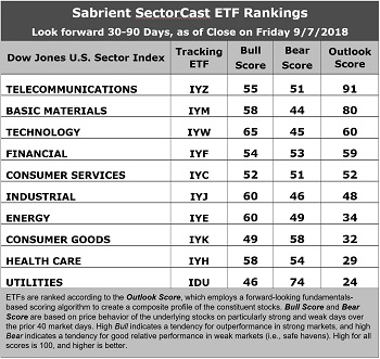Outlook score is forward-looking while Bull and Bear are backward-looking. As a group, these three scores can be helpful for positioning a portfolio for a given set of anticipated market conditions. Of course, each ETF holds a unique portfolio of stocks and position weights, so the sectors represented will score differently depending upon which set of ETFs is used. We use the iShares that represent the ten major U.S. business sectors: Financial (IYF), Technology (IYW), Industrial (IYJ), Healthcare (IYH), Consumer Goods (IYK), Consumer Services (IYC), Energy (IYE), Basic Materials (IYM), Telecommunications (IYZ), and Utilities (IDU). Whereas the Select Sector SPDRs only contain stocks from the S&P 500 large cap index, I prefer the iShares for their larger universe and broader diversity.