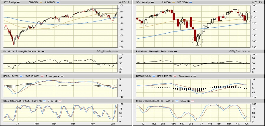 At the close of May, the technical picture for the SPDR S&P 500 ETF (SPY) was looking pretty bleak, having fallen from a new all-time high to below the 200-day simple moving average (SMA). But it was also deeply oversold and testing a strong support level near 272. In response, SPY bounced quite strongly last week (the best week since November), closing Friday June 7 at 287.65. Oscillators RSI and Slow Stochastic cycled down through oversold territory and back up, and now may be setting up for some consolidation and perhaps backfilling some of those price gaps, while MACD still looks like it could move higher. But make no mistake, the short-term technical picture on the daily chart is strong. The second chart shows the weekly picture, and it looks even stronger, as last week closed with a bullish engulfing candlestick. I have circled two other times over the past year in which a solidly green candle (either bullish engulfing in July or just a solid bounce from a severely overdone red candle in December) foreshadowed strong bullish move higher. I suggested in my prior article at the start of May that the bearish engulfing candle on May 1 (after making a new all-time high) might lead to some healthy profit-taking, retrenchment, and testing of support levels, which is exactly what happened. Now the bullish engulfing candle on the weekly chart, along with the upward-pointing oscillators, might be suggesting another imminent run at the highs.