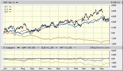 Oil got a little ahead of the others during March-April due to worries about supply disruptions, but has now settled in to the same roughly +25% gain, while the dollar is down closer to -14%, over the past 12 months.