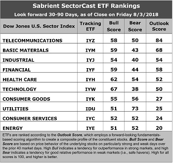 Outlook score is forward-looking while Bull and Bear are backward-looking. As a group, these three scores can be helpful for positioning a portfolio for a given set of anticipated market conditions. Of course, each ETF holds a unique portfolio of stocks and position weights, so the sectors represented will score differently depending upon which set of ETFs is used. We use the iShares that represent the ten major U.S. business sectors: Financial (IYF), Technology (IYW), Industrial (IYJ), Healthcare (IYH), Consumer Goods (IYK), Consumer Services (IYC), Energy (IYE), Basic Materials (IYM), Telecommunications (IYZ), and Utilities (IDU). Whereas the Select Sector SPDRs only contain stocks from the S&P 500 large cap index, I prefer the iShares for their larger universe and broader diversity.