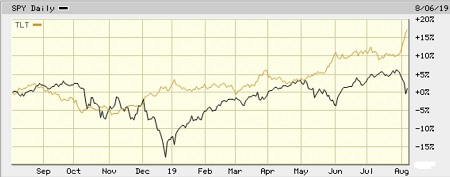 As for the inverted 3-month/10-year yield curve, I think that at such low interest rate levels, and given that the more-often watched 2-year/10-year has not inverted, it really doesn’t mean much. Many market participants see the persistent inversion in the US 3-month/10-year as a clear recession signal, despite economic data that continues to hold up pretty well, and despite the fact that the 3-month is driven by the Fed while the 10-year is driven by the market. Instead, as I have often stated, I think this inversion is a false signal. Low or negative rates overseas are pushing capital into our bond market, distorting our bond market dynamics, so the inversion is not the signal of impending recession that history would normally suggest, in my view. My regular readers know that I have long predicted that US rates would continue to find a bid given the ultra-soft rates elsewhere and the global demand for safe yield, driven by the carry trade, aging demographics, and automatic strategic allocations to fixed income funds from a world awash in liquidity. Just look at this 1-year comparison of the SPDR S&P 500 ETF (SPY) versus the iShares 20+ Year Treasury Bond ETF (TLT):