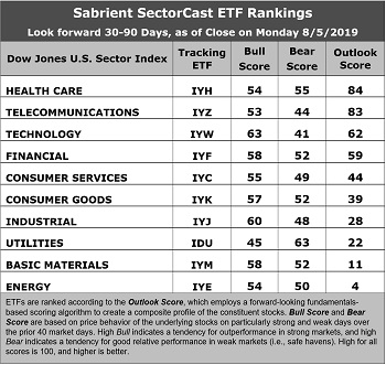 1. Healthcare move into the top spot with an Outlook score of 84, driven primarily by a trove of analyst upward revisions to EPS estimates. It also displays strong insider sentiment (open market buying activity), and moderate long-term projected EPS growth and return ratios. Taking second is Telecom with a score of 83. (It is worth noting that nearly 50% of the IYZ ETF is made up of just two stocks: CSCO and VZ.) Telecom displays the lowest forward P/E of 13.7x and good return ratios. However, its pure GARP metrics are only average, with projected year-over-year EPS growth rate of 7.0% and a forward PEG ratio (forward P/E divided by projected EPS growth rate) of 1.95, which ranks it 6th out of 10 sectors on PEG, ahead of only fellow defensive sectors Utilities and Consumer Goods (Staples/Noncyclical) as well as Basic Materials, which is why we don’t see many Telecoms as candidates for Sabrient’s GARP portfolios (which have a 12-24 month outlook rather than 2-6 months used in SectorCast). Technology remains in third with an Outlook score of 62, as it displays good sell-side analyst sentiment, a strong projected EPS growth rate of 12.9%, solid return ratios, and a moderate forward PEG of 1.51. Rounding out the top seven are Financial, Consumer Services (Discretionary/Cyclical), Consumer Goods (Staples/Noncyclical), and Industrial.
