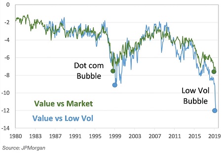 None of this describes the type of behavior you expect to see in a solid economy and rising stock market. Typically, the broad market indexes rise to new highs in a risk-on climate led by cyclicals and with strong market breadth that includes mid and small cap stocks. Well, to lend further support to these observations, JP Morgan recently discussed the historically large relative valuation gap between Value/Cyclicals and Low Volatility/Defensives that has characterized the market since at least June 2018. It essentially reinforces everything I have been talking about regarding market conditions over the past 15 months. The charts below says it all: