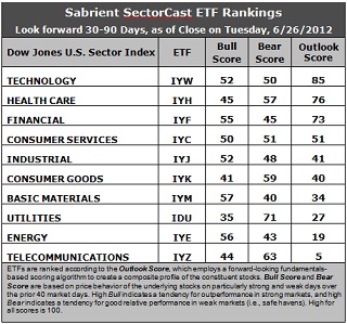 About Trading Strategies: There are various ways to trade these rankings. First, you might run a sector rotation strategy in which you buy long the top 2-4 ETFs from SectorCast-ETF, rebalancing either on a fixed schedule (e.g., monthly or quarterly) or when the rankings change significantly. Another alternative is to enhance a position in the SPDR Trust exchange-traded fund (SPY) depending upon your market bias. If you are bullish on the broad market, you can go long the SPY and enhance it with additional long positions in the top-ranked sector ETFs. Conversely, if you are bearish and short (or buy puts on) the SPY, you could also consider shorting the two lowest-ranked sector ETFs to enhance your short bias.