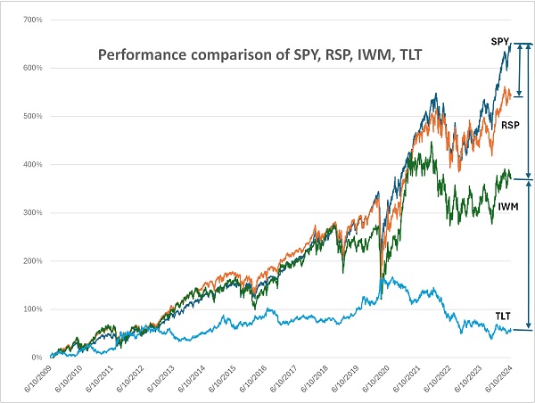 Narrow leadership from Big Tech has been in play periodically since around 2015 (when the FAANG acronym was coined), but it has really revealed itself during the current bull run began in October 2022. The following charts illustrate the magnitude of the divergences between the cap-weighted (and Big Tech-dominated) S&P 500 (SPY), the equal-weight S&P 500 (RSP), small-cap Russell 2000 (IWM), and the iShares 20+ Year Treasury Bond (TLT). You can see that from the Great Financial Crisis until the pandemic lockdowns, the stock and bond indexes all generally moved higher and then converged (as bonds surged while stocks collapsed) upon the onset of the pandemic. But ever since then, TLT has been falling (and interest rates rose). Meanwhile, SPY, RSP, and IWM all surged through 2020, but then large caps (both SPY and RSP) kept rising while small caps flattened out in 2021. Then, they all faltered in 2022. But SPY has surged once again to achieve several all-time highs while RSP and IWM have struggled for traction. While RSP did recently achieve an all-time high, it has not kept pace with SPY, and IWM is still 17% below its 2021 all-time high. YTD through 6/14, QQQ is up +17.2% and SPY +14.5%, while RSP is +4.2%, IWM -0.5%. Even more distressingly, the quality-biases SPDR S&P 600 SmallCap (SPSM) is down -2.7%.