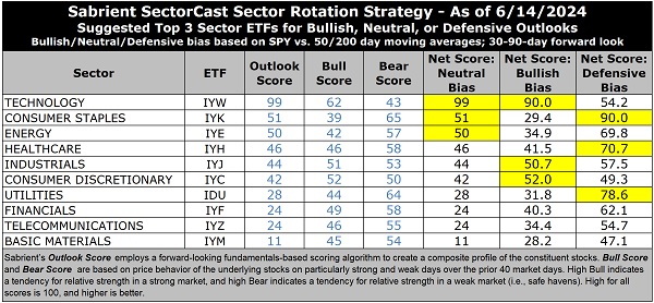 IMPORTANT NOTE: I post this information periodically as a free look inside some of our institutional research and as a source of some trading ideas for your own further investigation. It is not intended to be traded directly as a rules-based strategy in a real money portfolio. I am simply showing what a sector rotation model might suggest if a given portfolio was due for a rebalance, and I do not update the information on a regular schedule or on technical triggers. There are many ways for a client to trade such a strategy, including monthly or quarterly rebalancing, perhaps with interim adjustments to the bullish/neutral/defensive bias when warranted, but not necessarily on the days that I happen to post this article. The enhanced strategy seeks higher returns by employing individual stocks (or stock options) that are also highly ranked, but this introduces greater risks and volatility. I do not track performance of the ideas mentioned here as a managed portfolio.