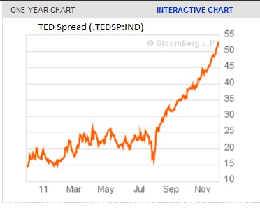 The VIX (CBOE Market Volatility Index – a.k.a. “fear gauge”) closed Wednesday at 27.80, which puts it well below the important 30 mark. With elevated levels of fear since August, VIX has had a devil of a time staying below 30. The TED spread (indicator of credit risk in the general economy, measuring the difference between the 3-month T-bill and 3-month LIBOR interest rates) just keeps on climbing, as shown in the Bloomberg chart below. It closed Wednesday at 52.89. Although not nearly so high as the extremes it hit during the 2008 financial crisis, it nevertheless is a far cry from the low-teens earlier this year, and indicates elevated investor worry about bank liquidity and a preference for the safety of Treasuries bonds over corporate bonds.