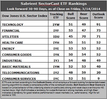 This week’s Outlook scores represent the view that Technology and Financial sectors are relatively undervalued, while Consumer Services and Telecom may be relatively overvalued based on our 1-3 month forward look.