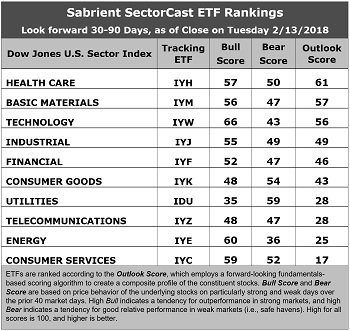 Outlook score is forward-looking while Bull and Bear are backward-looking. As a group, these three scores can be helpful for positioning a portfolio for a given set of anticipated market conditions. Of course, each ETF holds a unique portfolio of stocks and position weights, so the sectors represented will score differently depending upon which set of ETFs is used. We use the iShares that represent the ten major U.S. business sectors: Financial (IYF), Technology (IYW), Industrial (IYJ), Healthcare (IYH), Consumer Goods (IYK), Consumer Services (IYC), Energy (IYE), Basic Materials (IYM), Telecommunications (IYZ), and Utilities (IDU). Whereas the Select Sector SPDRs only contain stocks from the S&P 500 large cap index, I prefer the iShares for their larger universe and broader diversity.
