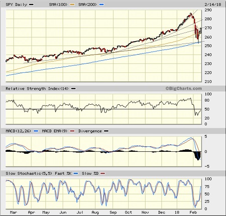 The SPDR S&P 500 ETF (SPY) closed Wednesday at 269.59, which was its fourth straight day of a positive close after the extreme market turmoil. It found support at the critical 200-day simple moving average (SMA) last Friday before finishing higher on the day with an impressive intraday recovery, leading into the 3 more days of positive performance. That was the first test of the 200-day SMA for SPY since the November 2016 election. I have drawn some “fan lines” on the chart, given how far the selloff went. You can see that the parabolic rise in January had the first (latest) fan line going vertical in an unsustainable way. The second fan line provided only momentary support before giving way the next day. The third fan line didn’t do much at all, but then the fourth fan line converged with the 200-day SMA, where the reversal occurred. However, a lot of technical damage was done, so once the deeply oversold conditions are worked off, we shall see where the market wants to go next. Oscillators RSI, MACD, and Slow Stochastic all have recovered quite a bit and seem to have further to go as they cycle back up toward neutral. After breaking through resistance from the 100-day SMA on Monday, and then retesting it each day this week, the third fan line seems to be creating a measure of overhead resistance at 270. Next resistance above that resides at the 50-day SMA near 272. Support levels come in at the 100-day SMA just below 265, and the 200-day SMA approaching 255. Looking at this technical picture, I am optimistic that the market won’t sell off below the 200-day SMA – although it may retest it.