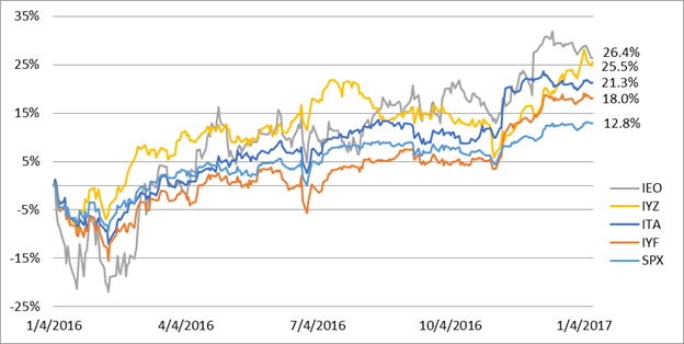 We will discuss firms from four different sectors that have all rallied strongly, especially over the last two months: finance, oil, telecom, and defense. Over the last year, the IYF (financial ETF), IEO (oil ETF), IYZ (telecom ETF), and ITA (defense ETF) have risen by 18%, 26%, 26%, and 21% respectively.