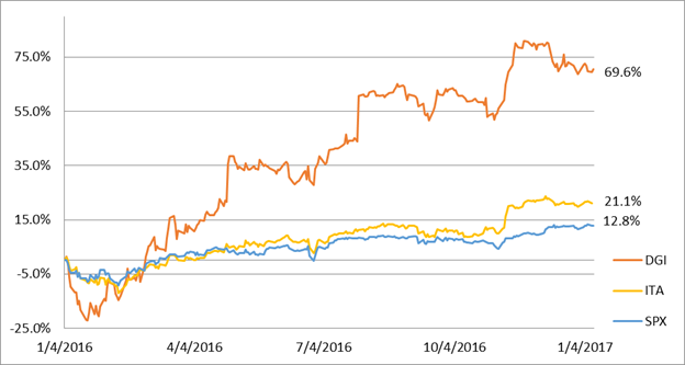 The defense sector has risen sharply since the election, largely on hopes that a united Republican front will be fairly accommodating. DigitalGlobe, Inc. (DGI), who produces high-resolution images and services sourced from its satellite constellation, also saw its share price rise along with the defense sector, increasing 70% YOY.
